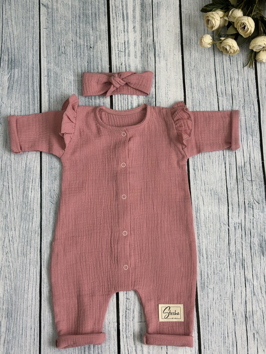 Теги: Купить оптом детский комбинезон . 336-П. Комбинезон с повязкой для девочки из муслина, хлопок 100%, размеры 56,62,68, пудра цена,отзывы официальный сайт "Стеша Крым"