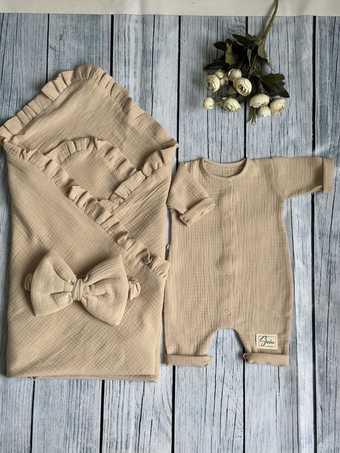 Теги: Купить детские конверты, комбинезон оптом, детские конверты на выписку оптом. 335-К. Комплект из детского комбинезона, р 56 и конверта муслин, хлопок 100% 90/90 см, кофейный цена,отзывы официальный сайт "Стеша Крым"